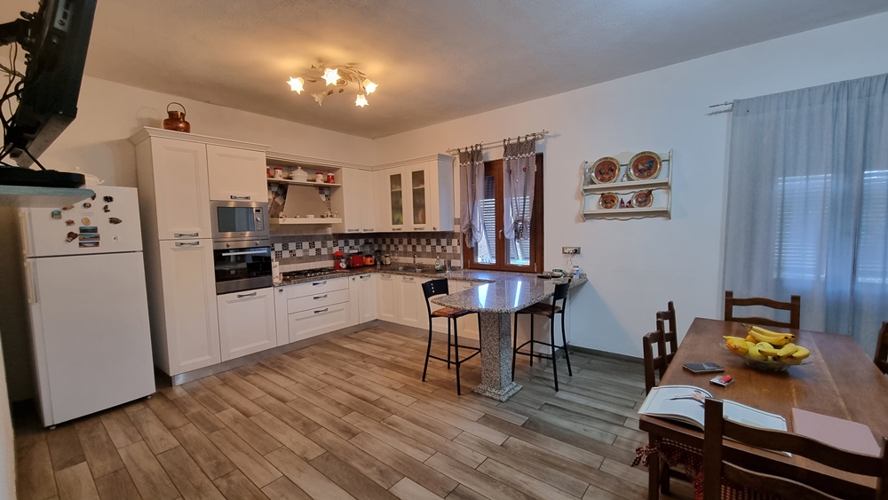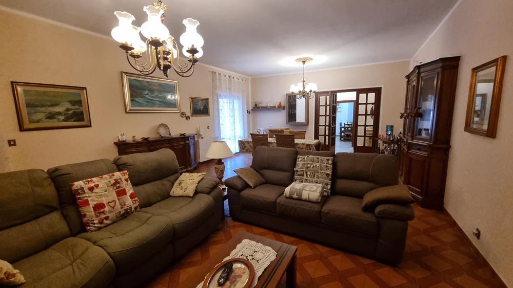 A circa 1 km dal paese, in villa trifamiliare, completamente sviluppato al piano rialzato, grandissimo appartamento composto da ingresso, cucina, salone con camino, disimpegno, n 4 camere, n 2 bagni. Dalla zona living si accede ad un grande e panoramico portico che a sua volta si affaccia sul giardino di proprietà. Adiacente all'abitazione la proprietà include altro appezzamento di terreno con olivi e graziosa piscina fuori terra, il tutto attiguo a magazzino di proprietà. L'immobile anche se datato si trova in ottimo stato di manutenzione, predisposto per qualsiasi soluzione sia uni che plurifamiliare...Richiesta € 330.000 tratt.li.
